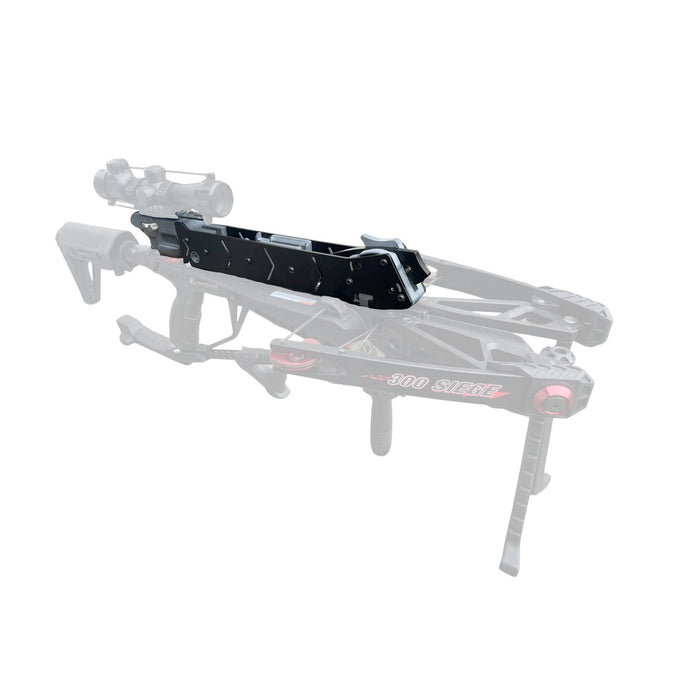 This repeater kit consists of a completely new magazine for seven arrows (7.5'' with 125grs arrowheads), a height-adjustable scope mount with a high-precision folding device, and a different arrow rail. The conversion can be done easily and reversibly with the included tools. With the kit mounted, the Siege then becomes perhaps the most interesting tactical crossbow ever! Scopes of any size can be mounted to allow long-range shots - thanks to the fold-down feature, the arrows can still be easily loaded at any time. The adjustable tilt of the scope allows "spot shooting" at any distance. Designed and manufactured in Germany, the magazine is sold only through GoGun.